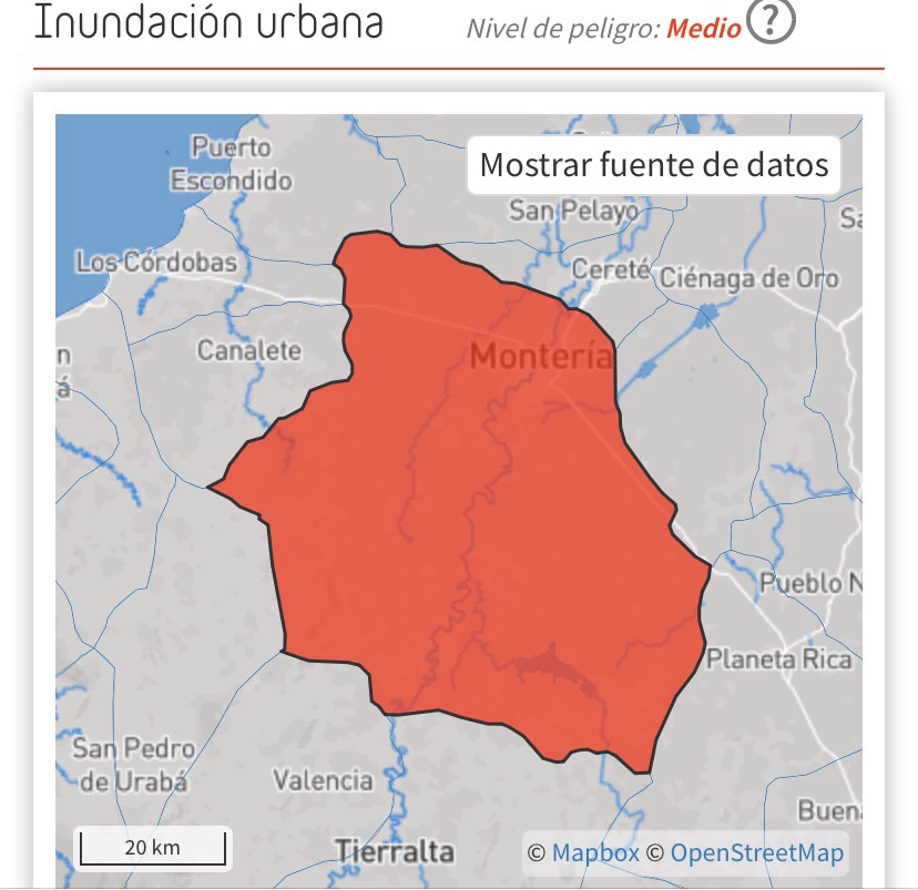 En Montería, el riesgo de inundación urbana se clasifica como medio, según la información disponible en las herramientas de análisis territorial. Esta categoría indica que existe más de un 20 % de probabilidad de que, en los próximos diez años, se presenten inundaciones urbanas potencialmente dañinas e incluso mortales.